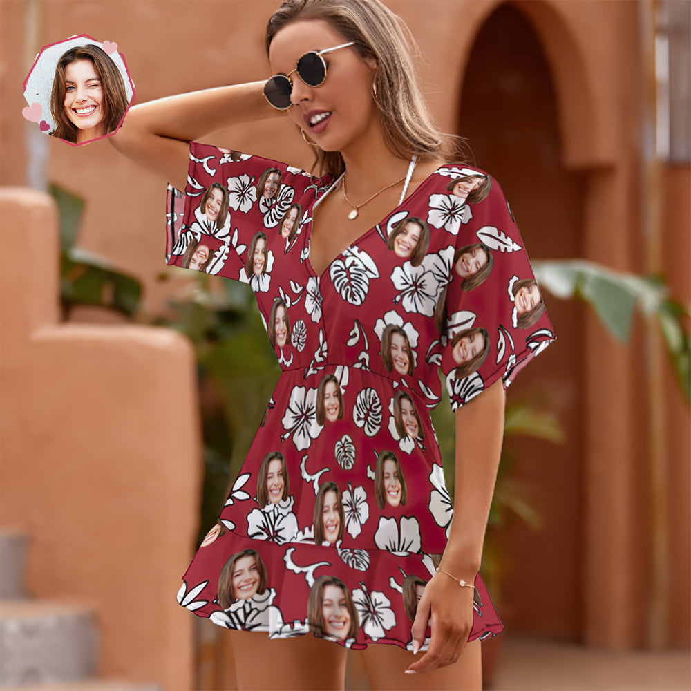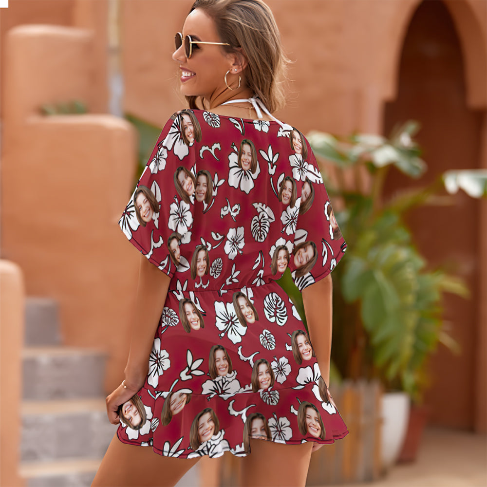 Custom Face Beach Wrap Hawaiian Style Red Flowers Cover Ups