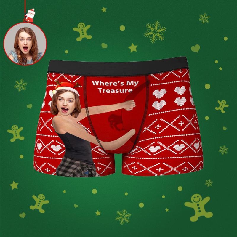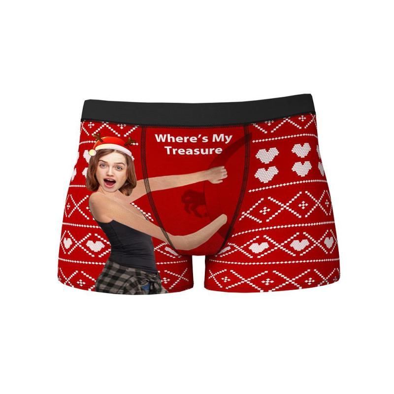 Custom Face Boxer Where's My Treasure Christmas Hug Body Boxer Shorts Your Face With Christmas Hat