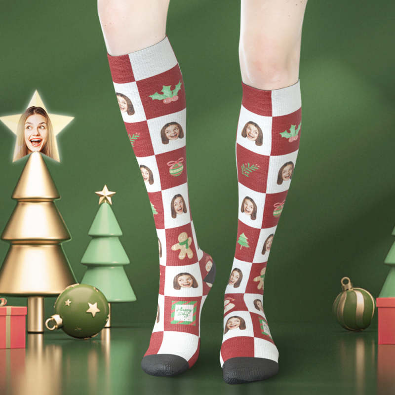 Custom Face Knee High Socks Christmas Tree & Checkered Pattern Socks