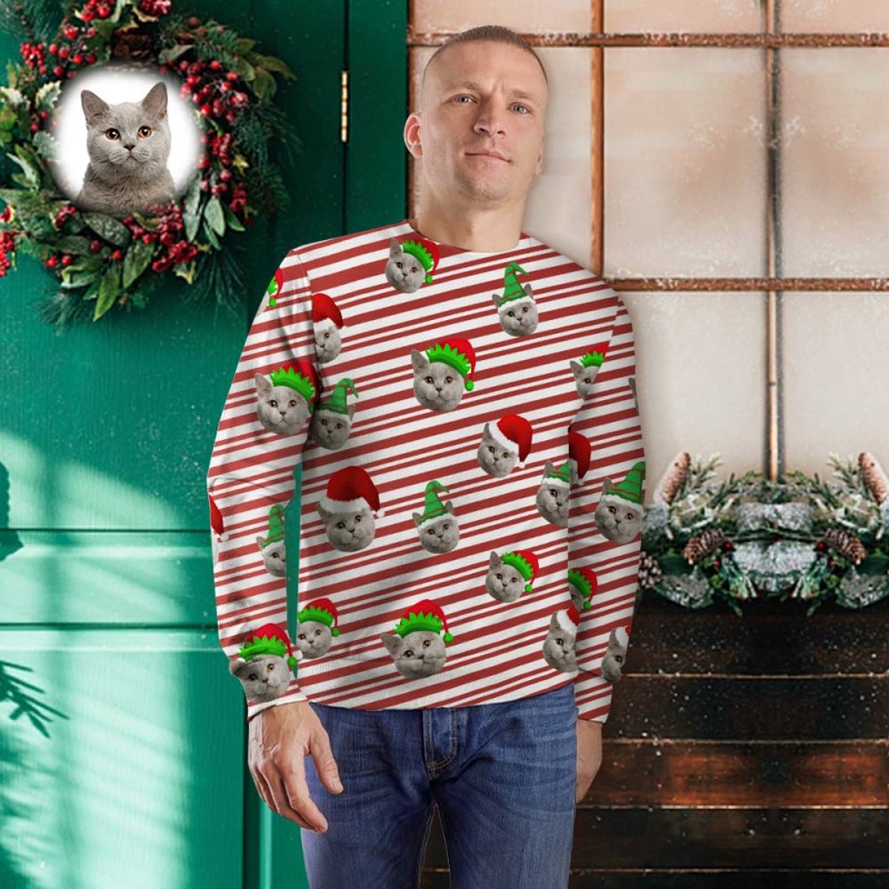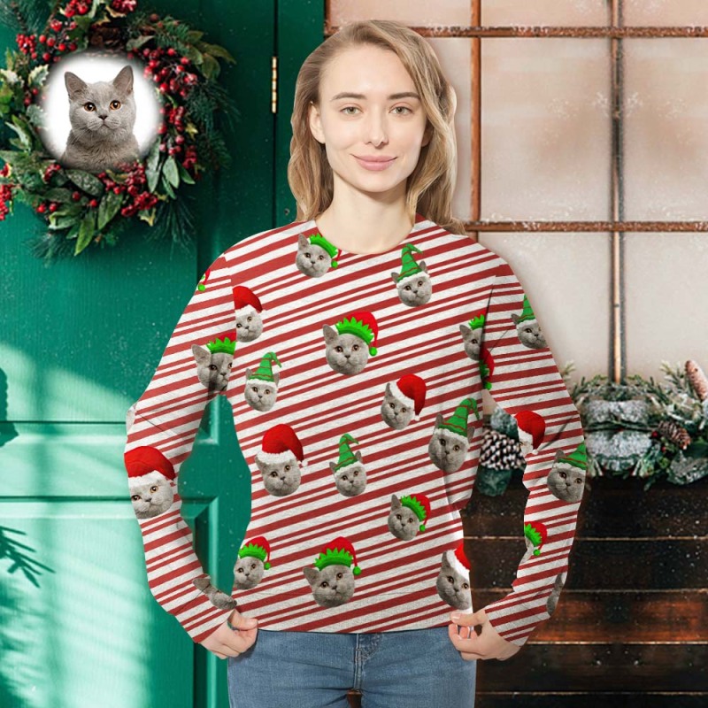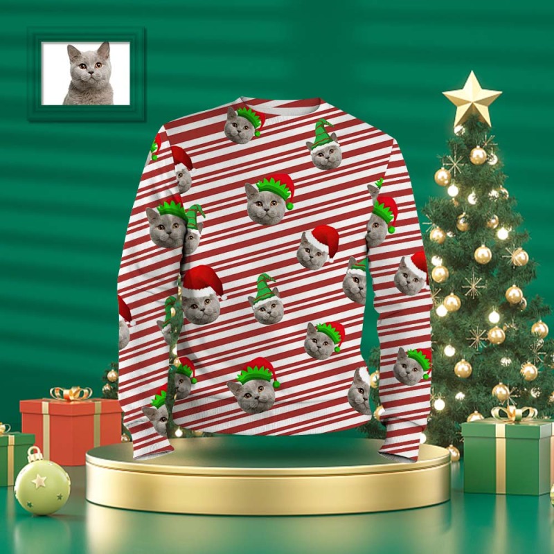 Custom Face Unisex Christmas Sweatshirt Casual Santa Elf Hats Stripe Crewneck Shirt