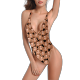 - Deep V neckline, low back and high leg.