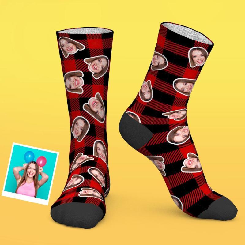 Custom Photo Socks Red Plaid Print Personalised Gift