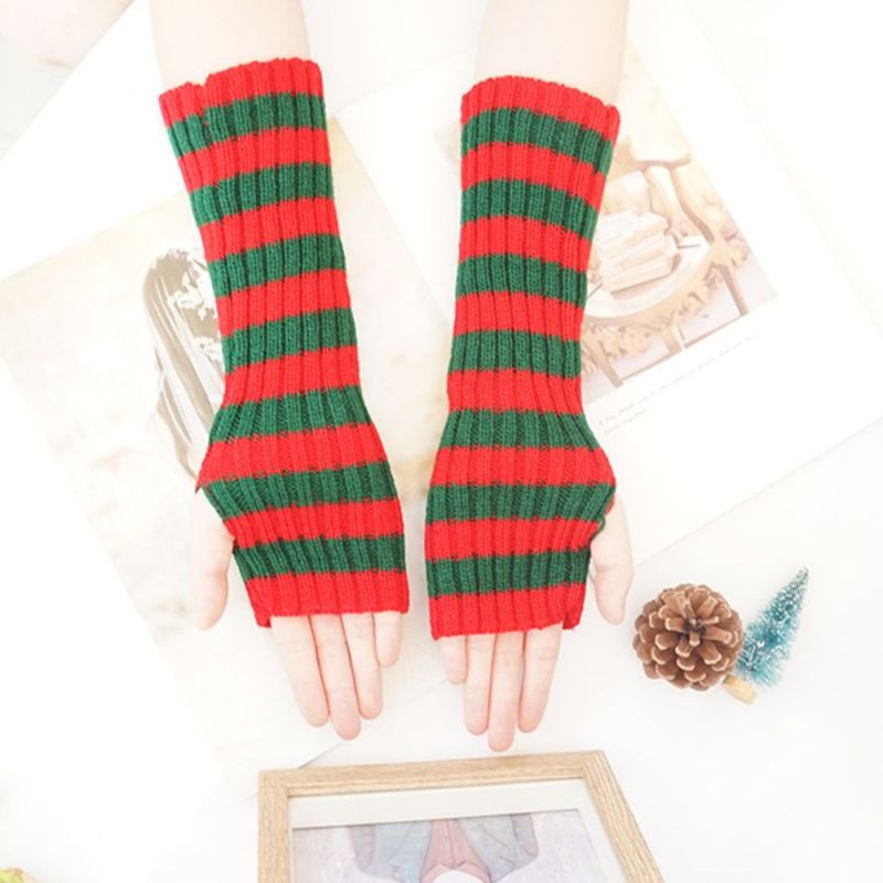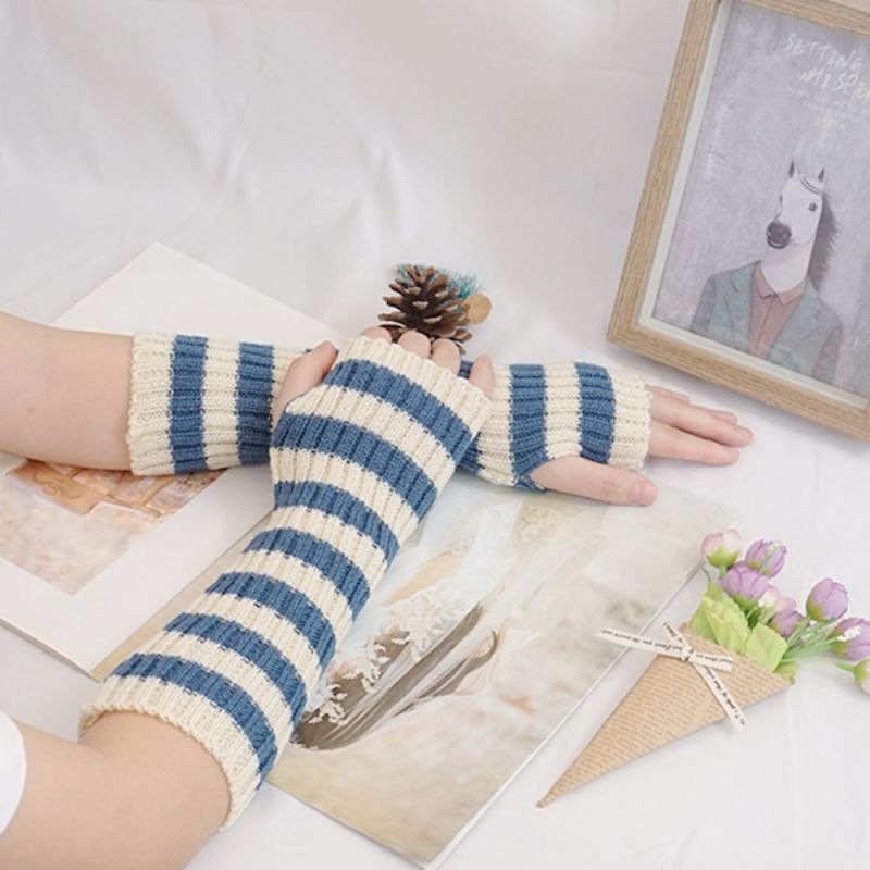 Knitted Chunky Striped Arm Cover Mid Length Winter Warm Half Finger Gloves
