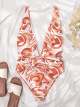 Women's Coffee Color Printed V-neck Swimsuit Women's Coffee Color Printed V-neck Swimsuit